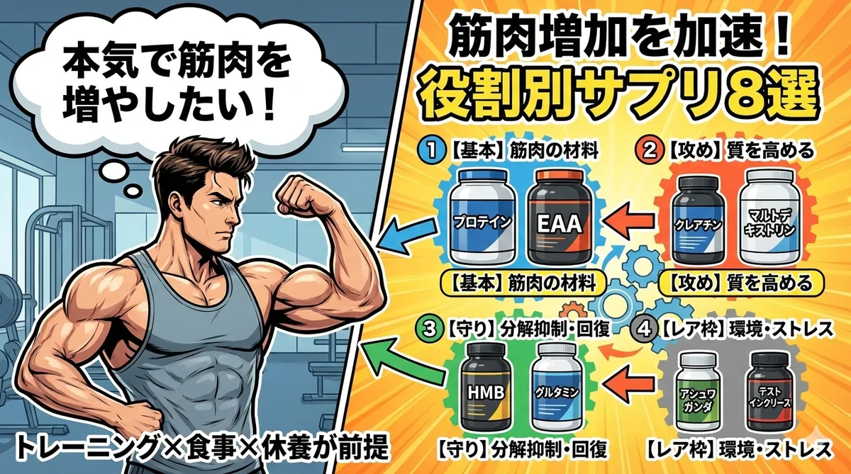 筋肉増加を支えるサプリは「役割」で考える