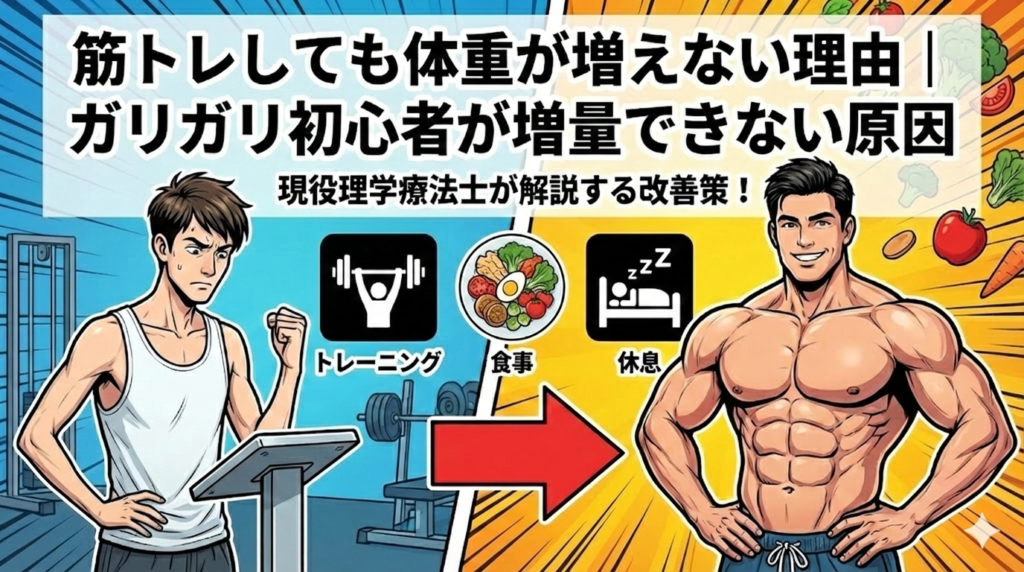 筋トレで増量しようと決意したガリガリ体型の初心者が、最初につまずくポイントは共通しています。 それは「頑張っているのに体重が増えない」「情報通りにやっているのに結果が出ない」という状態です。 結論から言うと、これは努力不足でも根性不足でも... -